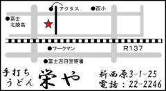 | アパートや住宅が立ち並ぶ新西原地区の一角にある手打ちうどん『栄屋』はこの場所でかれこれ25年、創業から80年以上を数える老舗。うどん店が多い富士吉田の中においても屈指の存在だ。朝7時半、早朝に練り上げておいた麺を延ばして茹でる作業が始まる。一心不乱に作業を行う三代目の渡辺行三さんのかたわらには、オーナーの谷野浩至さんの姿もある。親戚に当たる谷野さんは修行も兼ねて、渡辺さんとともにお店を切り盛りしている。 お昼ともなれば、7人掛けのテーブルと奥座敷一つの小さな店に入れ替わり立ち替わりお客さんが訪れる。人気は肉玉うどん(¥350)や、それに餅を入れた肉玉力うどん(¥400)といったところ。また、谷野さんが作るカレーうどんやカレーライスも好評。ほとんどの人が大盛り、または替え玉(ともに¥50)を頼むと聞けば、麺の美味しさもわかるのでは? ここでは昔から、個人や食堂向けに一玉60円で麺の玉売りも行っている。うどんを食べに来たお客さんが、帰りに買っていくほか、会社でまとめて注文を取り、社員で分けて持ち帰るというケースも多いといいます。年末やお祭りの時は忙しくなるとのことなので、大量に購入する際は事前連絡をしておくのがいい。 |