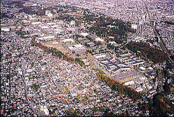 道すじ (16)中学四年の同級生が、何人も軍隊の学校に入った。陸軍予科士官学校に二人、海軍兵学校に一人海軍機関学校に一人。土浦海軍航空隊には、二年生のとき、何人かの同級生が入った。 士官学校は、埼玉県の朝霞町(現在は市)にあった。全国から数百人ほど入ったと思う。一つの部屋にベッドが六台あり一つは上級生で、生活全般の指導に当たった。 校舎は中隊単位で、一年二年がそれぞれ百人ほどだった。午前中は学科で、中隊ごとに隊を組んで教室棟に向かった。午後は軍隊訓練である。中隊ごとに専属の下士官が指導に当たった。 学科は現在の高校程度だったが、教官は優秀な人がそろっていて、生徒の向学心を満足させる内容だった。高等数学では微分・積分を教えていたから、終戦で故郷の高等学校に入ったとき、士官学校での授業内容が高度だったことがわかった。 各部屋の入口には、各人の歩兵銃が並べて置かれ、ていねいに手入れするよう、厳しく指導された。銃に個人の人格が反映する、というような指導であった。 終戦で家に帰ったときに、兄たち召集兵の軍隊とは大きく違うことがわかった。 私にとっては、軍隊教育は役立つ内容だった。 ※写真:朝霞市基地跡地の航空写真 (写真提供・朝霞市) |